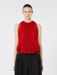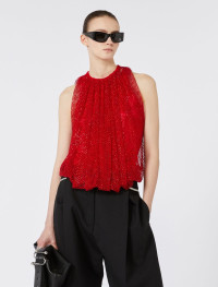 Dedicated to glamorous occasions, this mesh top features a sleeveless line and matching crystals applied all over. The elastic insert at the garment’s hem creates a bubble effect. - Mesh top with crystals and matching jersey tank top - Soft cut for the mesh layer, streamlined for the tank top - Rounded neckline - Sleeveless style - Bubble hem - Regular fit Composition and Care Jersey top jersey fabric 95% polyester, 5% elastane; - exclusive of decoration. Singlet 100% viscose. Jersey top: hand wash cold (40°c max); do not bleach; do not tumble dry; flat drying in the shade; do not iron; do not dry clean; do not wet clean.; Using neutral detergent.; Don’t rub. Singlet: machine wash cold delicate cycle; do not bleach; do not tumble dry; flat drying in the shade; cool iron; professionally dry clean perchloroethylene - mild process; professional wet cleaning - very mild process.; Iron with a cloth between.; Using neutral detergent.; Turn the articles inside out before washing.; To be ironed on reverse. Distributed by Max Mara S.r.l., registered office in Reggio Emilia (Italy), Via Giulia Maramotti 4, 42124