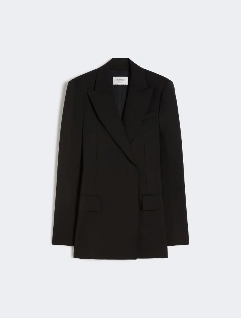Tailored blazer in luxurious natural stretch wool. The peak lapel and breast pocket evoke classic men's tailoring, modernised by the concealed fastening. - Natural stretch pure wool canvas blazer - Collar with peak lapels - Side pockets with double welt and flap - Double-breasted fastening with hidden buttons - Fitted waist Composition and Care Fabric 100% virgin wool; lining 70% acetate, 30% polyester; sleeves lining 97% viscose, 3% acetate. Do not wash; do not bleach; do not tumble dry; cool iron; professionally dry clean perchloroethylene - mild process; do not wet clean.; put this item into a string bag before washing it.; wash the garment while it is fastened. Distributed by Max Mara S.r.l., registered office in Reggio Emilia (Italy), Via Giulia Maramotti 4, 42124