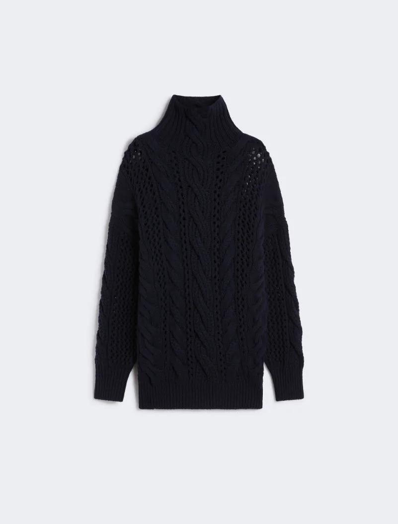 Oversized jumper featuring intricate detailing, with cable knits and openwork on the body and sleeves. Made in a soft, warm wool blend yarn. - Wool-blend jumper - Oversize fit - High neck - Cable knit and openwork stitch motif on the body and sleeves - Ribbed finish on the neck, cuffs and hem - Wide fit Composition and Care 70% wool, 30% polyamide. Do not wash; do not bleach; do not tumble dry; cool iron; professionally dry clean perchloroethylene - mild process; do not wet clean.; iron with a cloth between. Distributed by Max Mara S.r.l., registered office in Reggio Emilia (Italy), Via Giulia Maramotti 4, 42124