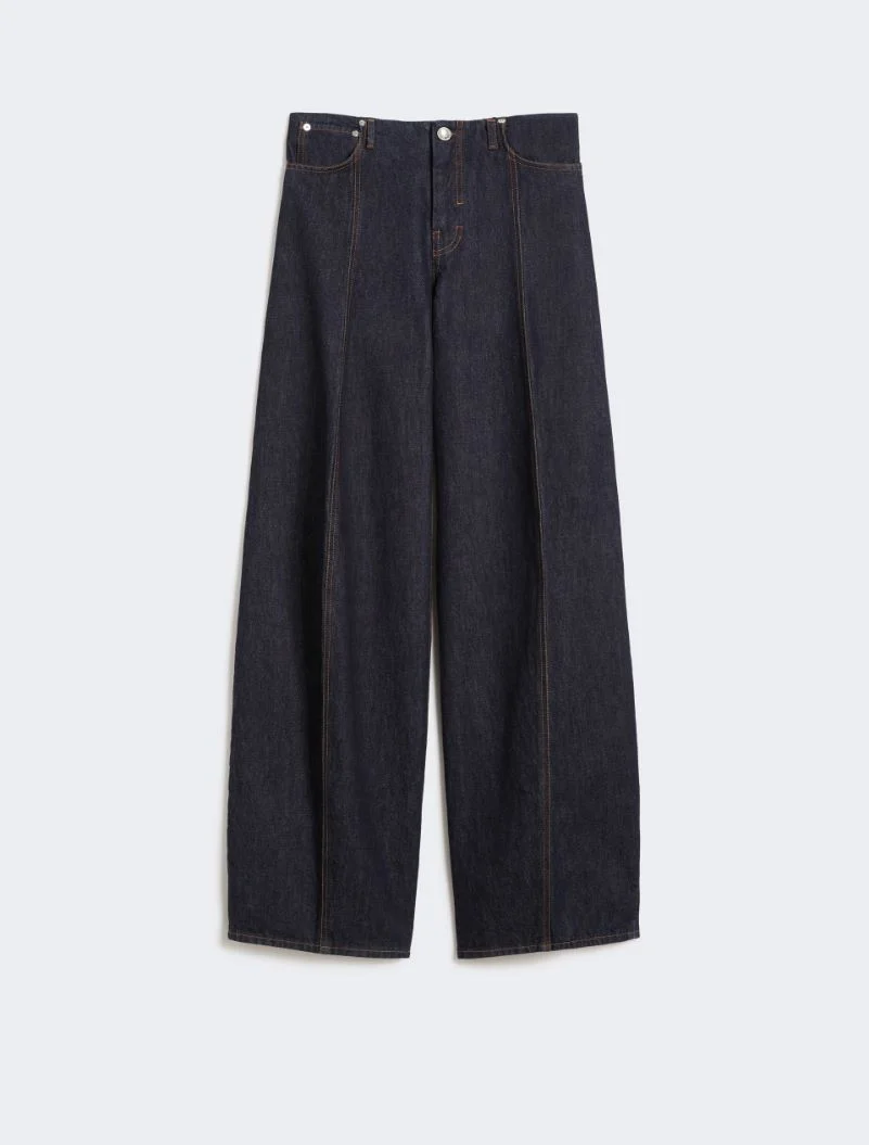 New five-pocket jeans with an innovative shape, with a rounded line at the knee and loose fit. The construction without a waistband emphasises the clean look of the trousers.. - Authentic, non-stretch indigo denim trousers with a dark, clean, medium vintage treatment - Oversize fit with low waist and low crotch - Five-pocket construction without waistband - Rounded legs at the front, with vertical seams - Contrasting stitching and custom rivets with S-rivet on the left - Wide fit Composition and Care 100% cotton. Machine wash cold delicate cycle; do not bleach; do not tumble dry; line drying in the shade; cool iron; do not dry clean.; wash the garment while it is fastened.; do not iron the buttons.; take care when wearing light-coloured clothes or accessories because, with the heat of the body, the indigo fabric , may fade and stain. be careful while sitting on light coloured surfaces, especially if wet. wash garments separately and always turned inside out. hang the garment turned inside out by avoiding to expose it to direct sunlight. avoid removing isolated stains.; contains non-textile parts of animal origin. Distributed by Max Mara S.r.l., registered office in Reggio Emilia (Italy), Via Giulia Maramotti 4, 42124