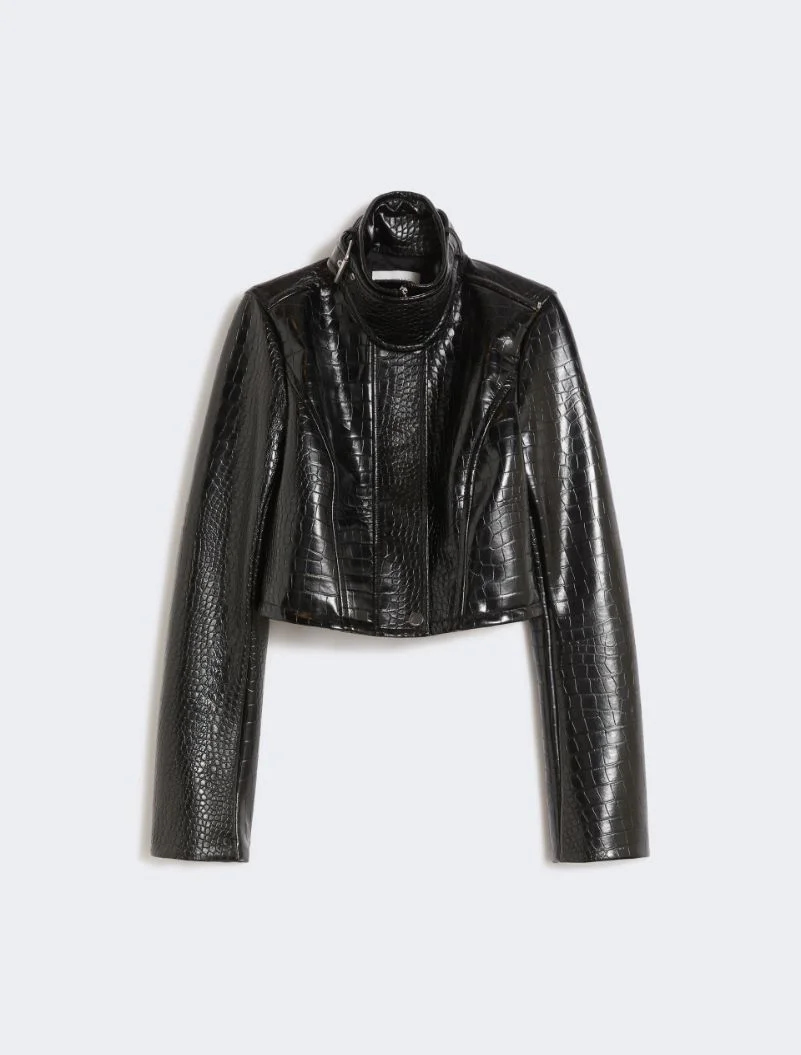 Short, fitted jacket in alligator embossed patent leather, to add a bold touch to your looks. The raised collar with storm flap is a detail borrowed from the trench coat, while the zip fastening and contoured seams take inspiration form biker jacket designs. - Jacket in jersey-bonded coated fabric, with an alligator embossed patent-leather finish - Polo neck with removable storm flap and metal buckle - Concealed zip fastening and flared sleeves - Interplay of contoured and topstitched seams throughout the garment - Fitted Composition and Care Jersey fabric 100% polyester; coating polyurethane; lining 70% acetate, 30% polyester. Machine wash cold delicate cycle; do not bleach; do not tumble dry; line drying in the shade; do not iron; do not dry clean.; wash the garment while it is fastened. Distributed by Max Mara S.r.l., registered office in Reggio Emilia (Italy), Via Giulia Maramotti 4, 42124