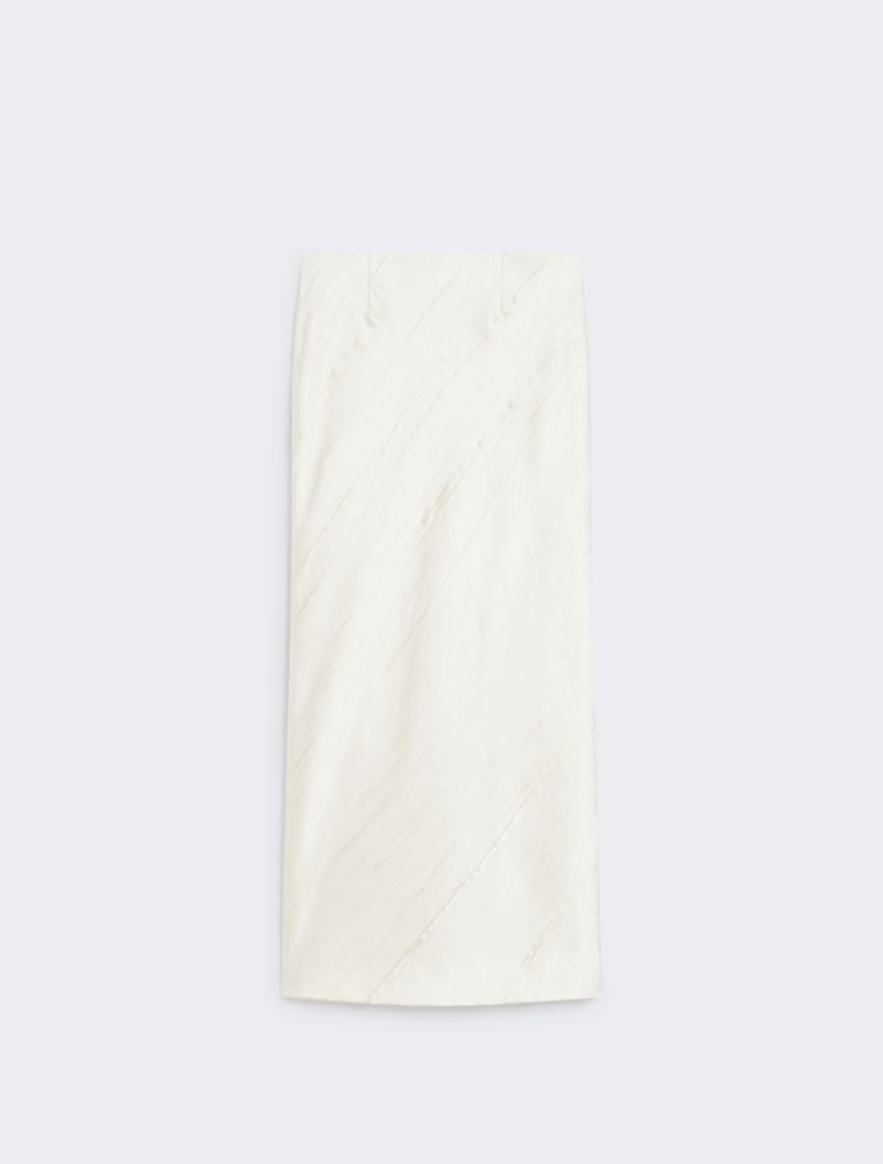 Clean-cut pencil skirt made of satin, coupled with irregular pleating. The effect is a dynamic and material twill motif. - Pencil skirt in bonded and pleated technical satin with bias cut - Straight fit with low waist - Opened by a concealed zip on the back. - Darts at waist with central back slit - Lined - Regular fit Composition and Care Fabric 100% polyester; lining 100% polyester. Hand wash cold (40°c max); do not bleach; do not tumble dry; line drying in the shade; do not iron; professionally dry clean perchloroethylene - mild process; do not wet clean. Distributed by Max Mara S.r.l., registered office in Reggio Emilia (Italy), Via Giulia Maramotti 4, 42124