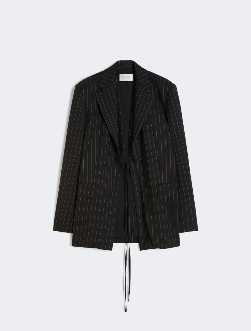 Tailored blazer with a double front motif that creates a refined layering. The fastening with fabric ties completes the design with an original touch. - Tailored blazer in stretch technical wool gabardine with lining - Lapel neckline - Double front that fastens with a fabric string - Side pockets with double welt and flap - Regular fit Composition and Care Fabric 54% virgin wool, 44% polyester, 2% elastane; lining 70% acetate, 30% polyester; sleeves lining 97% viscose, 3% acetate. Do not wash; do not bleach; do not tumble dry; cool iron; professionally dry clean perchloroethylene - mild process; do not wet clean. Distributed by Max Mara S.r.l., registered office in Reggio Emilia (Italy), Via Giulia Maramotti 4, 42124