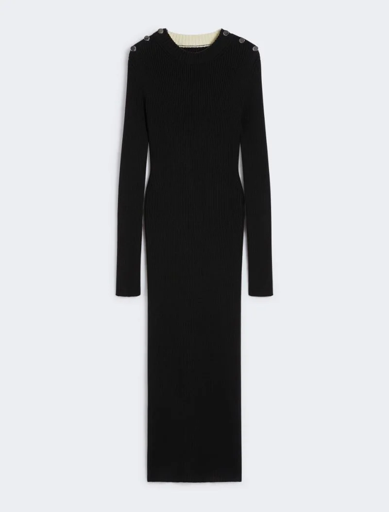 Pure wool knitted dress, with a fitted, feminine line. The metallic, custom buttons accentuate the shoulder opening and the sleeve end. - Pure wool knit dress - Fitted - Rounded neckline - Opening on the shoulder with custom metallic buttons - Ribbed detail on neckline and sleeve end - Cuffs with custom metallic snap buttons - Fitted Composition and Care 95% virgin wool, 5% polyamide. Hand wash cold (40°c max); do not bleach; do not tumble dry; flat drying in the shade; cool iron; professionally dry clean perchloroethylene - mild process; do not wet clean.; iron with a cloth between.; using neutral detergent.; protect buttons before washing. Distributed by Max Mara S.r.l., registered office in Reggio Emilia (Italy), Via Giulia Maramotti 4, 42124