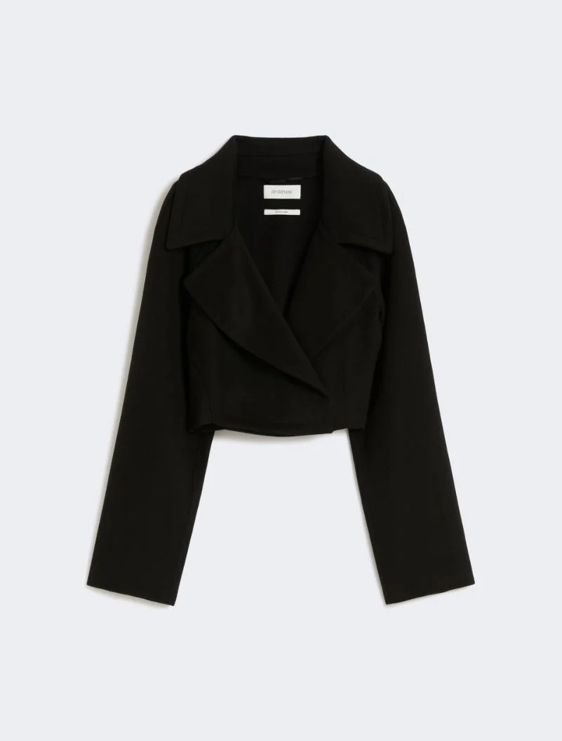 Short and fitted, this outerwear piece takes inspiration from tailored coats for the upper part, with wide lapels and a concealed fastening. The knitted insert on the sides and back yoke define the waist, tightening the silhouette. - Double-face pure wool drap cropped jacket - Lapel neckline and fastening with concealed snap buttons - Knit inserts on the sides and back yoke - Raglan sleeves - Fitted Composition and Care Fabric 100% virgin wool; - except joining thread; with knitted details 85% virgin wool, 13% polyester, 2% elastane. Do not wash; do not bleach; do not tumble dry; cool iron; professionally dry clean perchloroethylene - mild process; do not wet clean.; wash the garment while it is fastened. Distributed by Max Mara S.r.l., registered office in Reggio Emilia (Italy), Via Giulia Maramotti 4, 42124