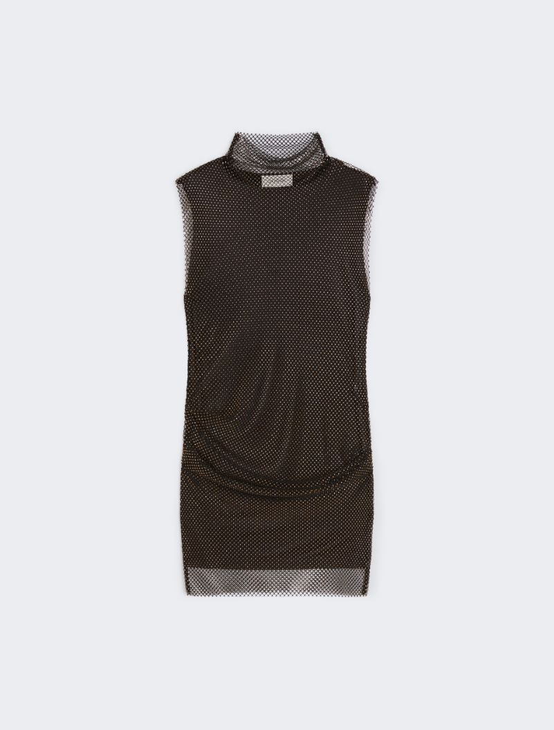 Sleeveless dress made of mesh, decorated with applied rhinestones. The soft collar and feminine fit are accompanied by an original construction with asymmetrical pleats on the side. - Sleeveless dress in technical mesh with applied rhinestones - Feminine fit - Crater neck with draping and sleeveless line - Asymmetrical draping motif on the hips - Sleeveless slip in viscose jersey - Fit Composition and Care Jersey dress jersey fabric 97% polyester, 3% elastane; - exclusive of decoration. Petticoat 100% viscose. Jersey dress: hand wash cold (40°c max); do not bleach; do not tumble dry; flat drying in the shade; do not iron; do not dry clean; do not wet clean.; Using neutral detergent.; Don’t rub. Petticoat: do not wash; do not bleach; do not tumble dry; cool iron; professionally dry clean perchloroethylene - mild process; do not wet clean.; Iron with a cloth between. Distributed by Max Mara S.r.l., registered office in Reggio Emilia (Italy), Via Giulia Maramotti 4, 42124