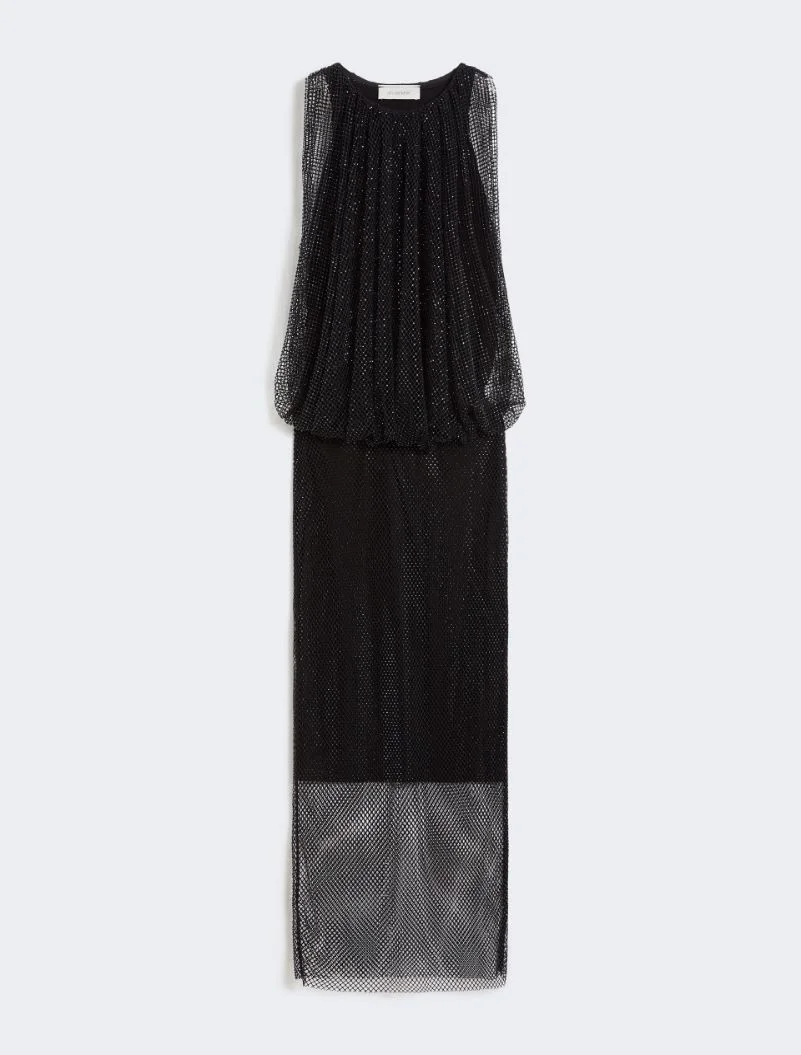 Mesh dress with rhinestones applied all over for a sparkling effect. Sleeveless, with a soft top, it is completed with a matching tank-top style jersey slip. - Mesh dress with rhinestones and jersey slip - Loose cut on the bodice and straight on the skirt - Rounded neckline - Sleeveless style - Elasticated insert at the waist for a bubble effect on the top - Regular fit Composition and Care Jersey dress jersey fabric 95% polyester, 5% elastane; - exclusive of decoration. Petticoat 100% viscose. Jersey dress: hand wash cold (40°c max); do not bleach; do not tumble dry; flat drying in the shade; do not iron; do not dry clean; do not wet clean.; Using neutral detergent.; Don’t rub. Petticoat: machine wash cold delicate cycle; do not bleach; do not tumble dry; flat drying in the shade; cool iron; professionally dry clean perchloroethylene - mild process; professional wet cleaning - very mild process.; Iron with a cloth between.; Using neutral detergent.; Turn the articles inside out before washing.; To be ironed on reverse. Distributed by Max Mara S.r.l., registered office in Reggio Emilia (Italy), Via Giulia Maramotti 4, 42124