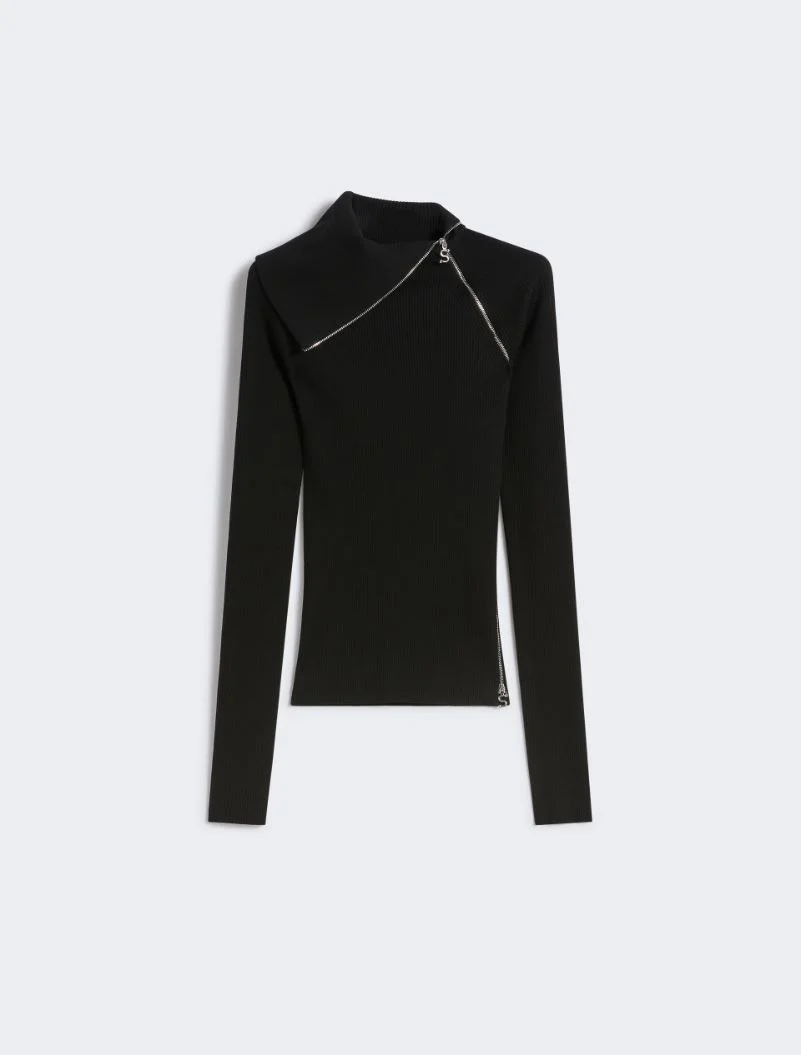 Wool-blend jumper in a stretch yarn that accentuates the silhouette. The special collar construction with diagonal zip, and second zip on the left, adds a sporty note to the design. - Jumper made of a stretch wool-blend yarn - Fitted - High neck with contrasting interior - Diagonal zip opening on neck and left shoulder - Side zip opening on the left side - Raglan sleeves - Fitted Composition and Care 100% virgin wool. Hand wash cold (40°c max); do not bleach; do not tumble dry; flat drying in the shade; cool iron; professionally dry clean perchloroethylene - mild process; do not wet clean.; iron with a cloth between.; using neutral detergent.; protect accessories before washing. Distributed by Max Mara S.r.l., registered office in Reggio Emilia (Italy), Via Giulia Maramotti 4, 42124