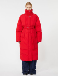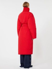 Long, enveloping down jacket, secured at the waist with a matching belt. Raised knit collar and side pockets with large flap. - Water-repellent technical fabric down jacket with crinkle effect and goose down - Straight fit - Raised knit collar - Hidden front zip opening and visible, custom top button. Belt with buckle - Flapped side pockets - Lined - Wide fit Composition and Care Fabric 100% polyamide; lining 100% polyamide; with quilting in 100% polyester; with knitted details 100% polyester; with quilting virgin down. Machine wash cold delicate cycle; do not bleach; do not tumble dry; line drying in the shade; cool iron; professionally dry clean perchloroethylene - mild process.; wash the garment while it is fastened.; turn the articles inside out before washing.; remove the belt before washing.; contains non-textile parts of animal origin. Distributed by Max Mara S.r.l., registered office in Reggio Emilia (Italy), Via Giulia Maramotti 4, 42124