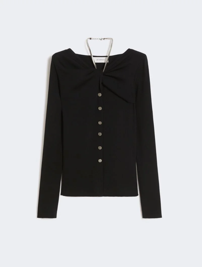 New jumper, streamlined on the body, with rounded neckline and metal chain detail on the front neckline. Cardigan-style buttoning that opens from the bust down. - Pure virgin wool jumper - Rounded neckline with chain inserted on the front - Closure with customised metal buttons - Functional buttons from the bust down - Regular fit Composition and Care Knitted fabric 100% virgin wool; - exclusive of accessories. Hand wash cold (40°c max); do not bleach; do not tumble dry; flat drying in the shade; cool iron; professionally dry clean perchloroethylene - mild process; do not wet clean.; iron with a cloth between.; before cleaning the style remove the accessories.; using neutral detergent.; protect buttons before washing. Distributed by Max Mara S.r.l., registered office in Reggio Emilia (Italy), Via Giulia Maramotti 4, 42124