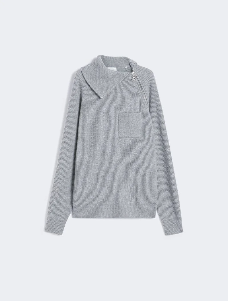 Loose and enveloping, the cashmere blend jumper features a soft volume and a special construction with a raised collar and diagonal zip. - Wool and cashmere yarn jumper - Loose fit - High neck with contrasting interior - Diagonal zip opening on neck and left shoulder - Patch pocket on the chest - Raglan sleeves - Wide fit Composition and Care 80% wool, 20% cashmere. Hand wash cold (40°c max); do not bleach; do not tumble dry; flat drying in the shade; cool iron; professionally dry clean perchloroethylene - mild process; do not wet clean.; iron with a cloth between.; using neutral detergent.; protect accessories before washing. Distributed by Max Mara S.r.l., registered office in Reggio Emilia (Italy), Via Giulia Maramotti 4, 42124
