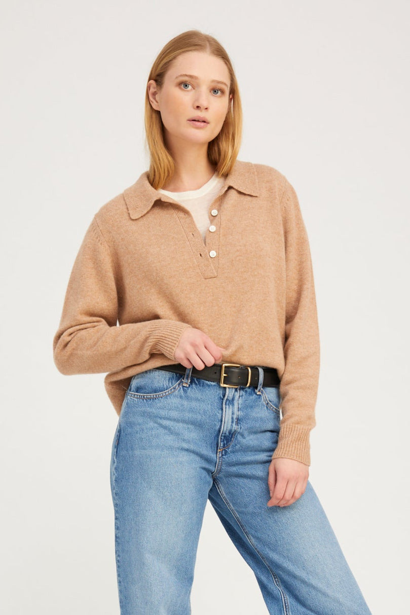 The Cashmere Polo Sweater, a timeless staple reimagined in ultra-soft, luxurious Mongolian yarn. Designed with a relaxed silhouette, this sweater features a refined polo collar with a three-button placket and ribbed trims for a clean finish. This is the perfect transitional piece for layering or wearing solo. COLOR: Almondine FIT & MEASUREMENTS - Fits true to size; relaxed fit - Emma is 5'10" & wears size Small PRODUCT DETAILS - 100% Cashmere - Sustainably grown, organic yarn - Polo-style collar with tonal button placket - Long sleeves with ribbed cuffs - Ribbed hemline - Dry clean only