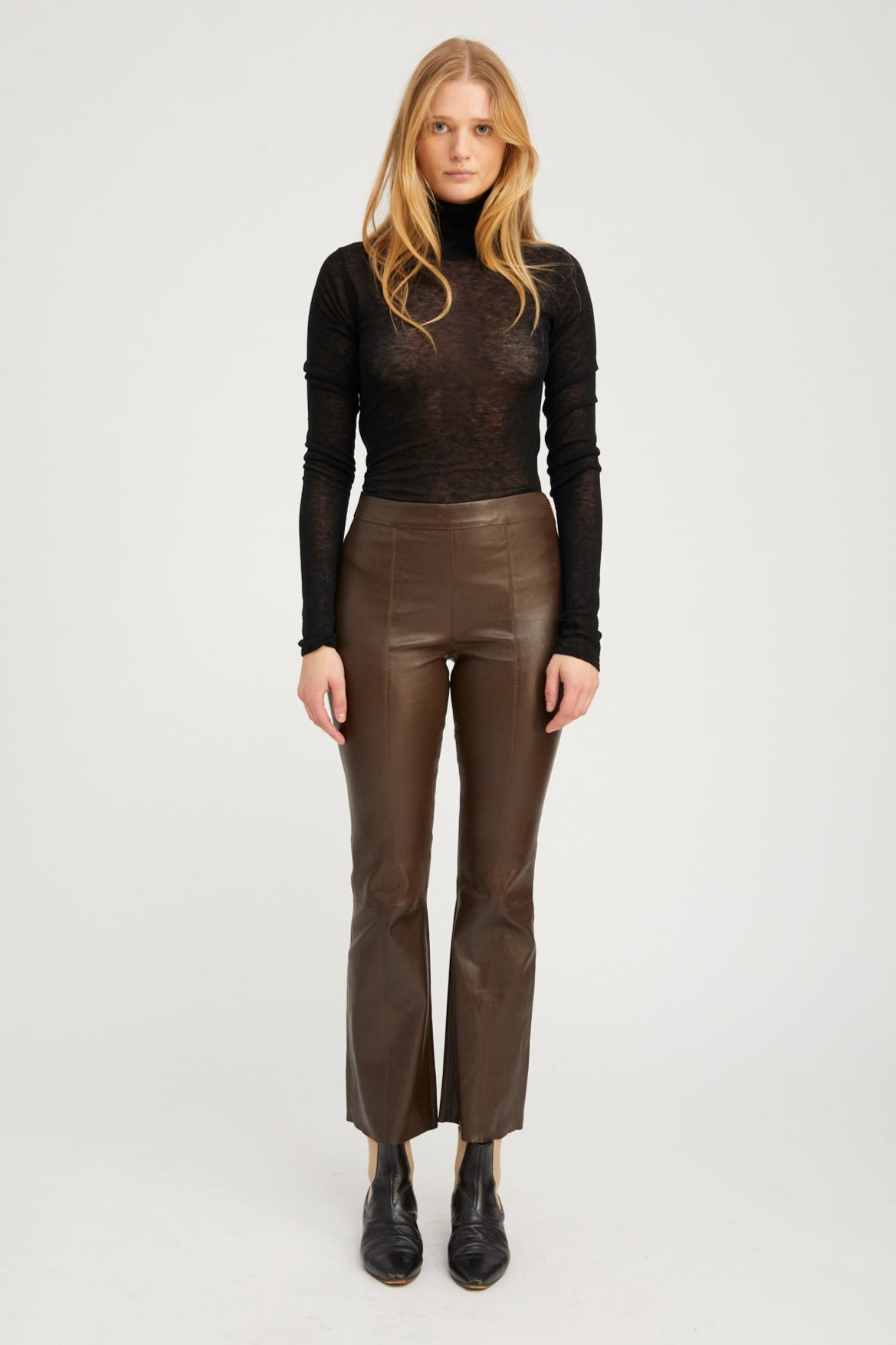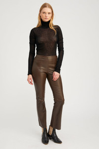 Made in our signature stretchy plonge leather, our Ankle Flare Pants with Princess Seams are buttery soft and feel like a second-skin. These pants feature a high rise and slim fit that flare subtly flare out at the ankle, with princess seams down the front and back for an ultra slimming and elongated look. Wear them with loafers and a cashmere sweater, or dress them up with heels. COLOR: Americano FIT & MEASUREMENTS - Fits true to size - Meant to fit tight at first-try – leather naturally gives; if in between sizes, size down - High-rise, slim fit - 28.5" inseam - Emma is 5'10" & wears size Small PRODUCT DETAILS - 100% French Lambskin - Stretch Leather - Cotton-Lycra lining - Elastic waistband, pull-on fit - Eco friendly, hypoallergenic and chrome-free vegetal dyed - Leather specialist clean only