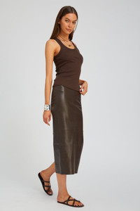 Our classic leather tube skirt is a wardrobe hero. Made from our ultrasoft, Plonge leather, this lightweight, breathable staple feels like a second-skin on. Designed with maximum recovery to conform to your body and maintain its stretch and comfort all night long. Constructed from panels of hand-stitched French leather and fitted with a back slit for easy wearability. Wear with its matching tube top for the complete look. COLOR: Americano FIT & MEASUREMENTS - Fits true to size - Meant to fit tight at first-try – leather naturally gives; if in between sizes, size down - 34" length, 12" back slit - Lauren wears size Small PRODUCT DETAILS - 100% French Lambskin - Stretch Leather, Cotton-Lycra lining - Elastic waistband, pull-on fit - Eco friendly, hypoallergenic and chrome-free vegetal dyed - Leather specialist clean only