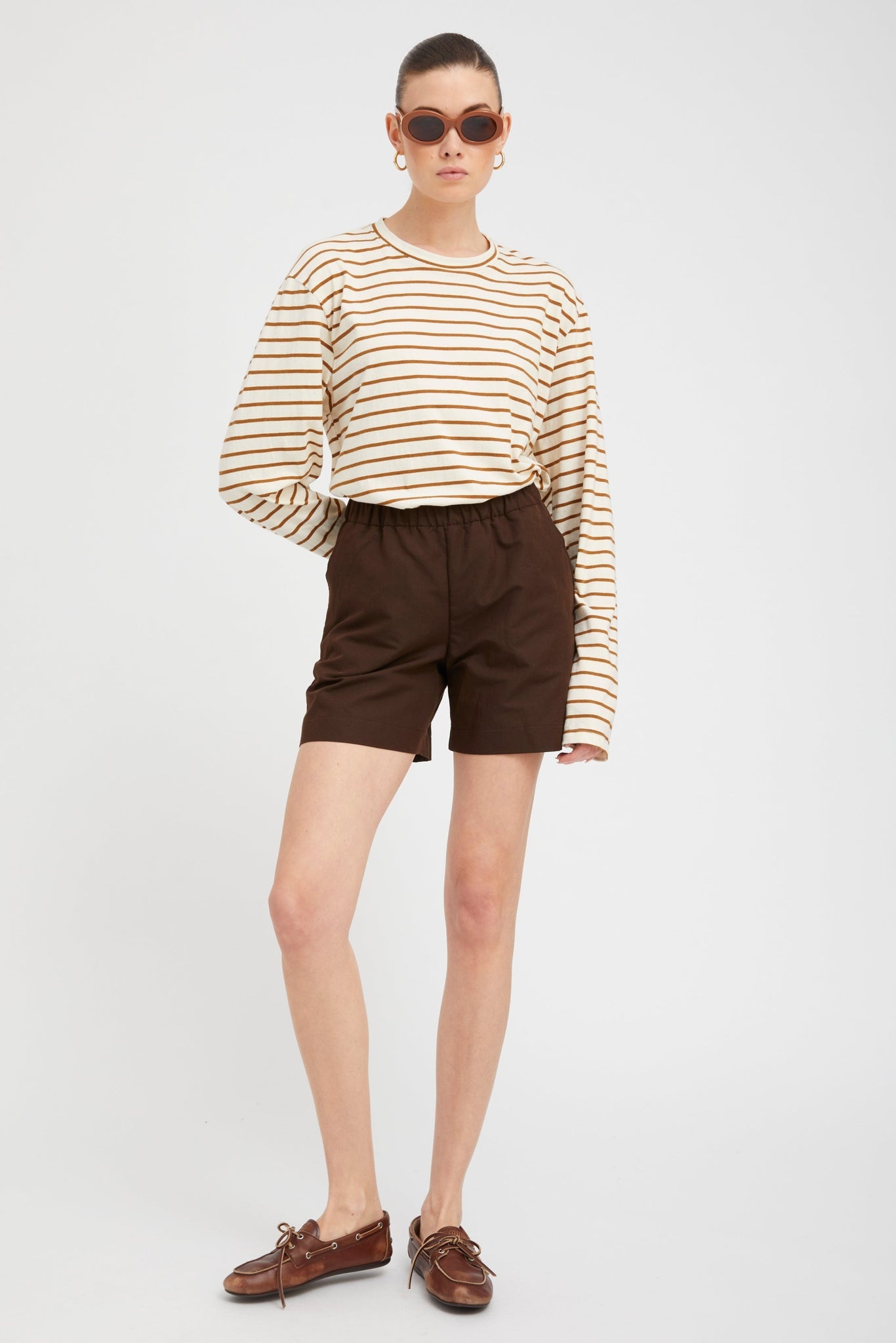 Our Culotte Shorts are fitted at the waist with an A-line shape for an effortlessly flattering look that highlights your natural waistline. Made from ultra lightweight and breathable linen, these shorts will keep you feeling cool and airy all season long. With endless styling options, these pair well with our Isabel Top or a classic ribbed tank. COLOR: Americano FIT & MEASUREMENTS - Fits true to size; Relaxed fit - Kennedy is 5'11 & wears size Small PRODUCT DETAILS - 57% Linen, 43% Cotton - Machine wash cold, lay flat to dry