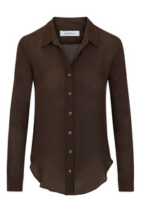 Our take on the classic collared button down, made in a luxurious and featherweight silk. Designed to have a slightly more slimming fit, this sheer button down pairs well with our silk trousers or your favorite leather trousers. COLOR: Americano Brown FIT & MEASUREMENTS - Fits true to size - Adama is 5'11 & wears size Small PRODUCT DETAILS - 100% Silk - See through - Dry clean only