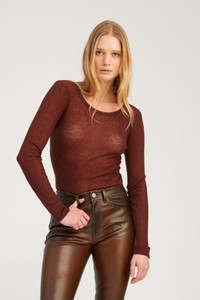 Our classic long sleeve baby tee, but made from our featherweight Tissue Cashmere, which enhances its elegant drape and flattering silhouette. Knitted from our ultra-soft Mongolian yarn, this closet essential has an easy crew neckline and is designed for a slightly loose fit, making it the perfect everyday go-to. COLOR: Americano FIT & MEASUREMENTS - Fits true to size - Emma is 5'10" & wears size Small PRODUCT DETAILS - 100% Cashmere - Sustainably grown, organic yarn - Ultra lightweight - Room for layering - Dry clean only