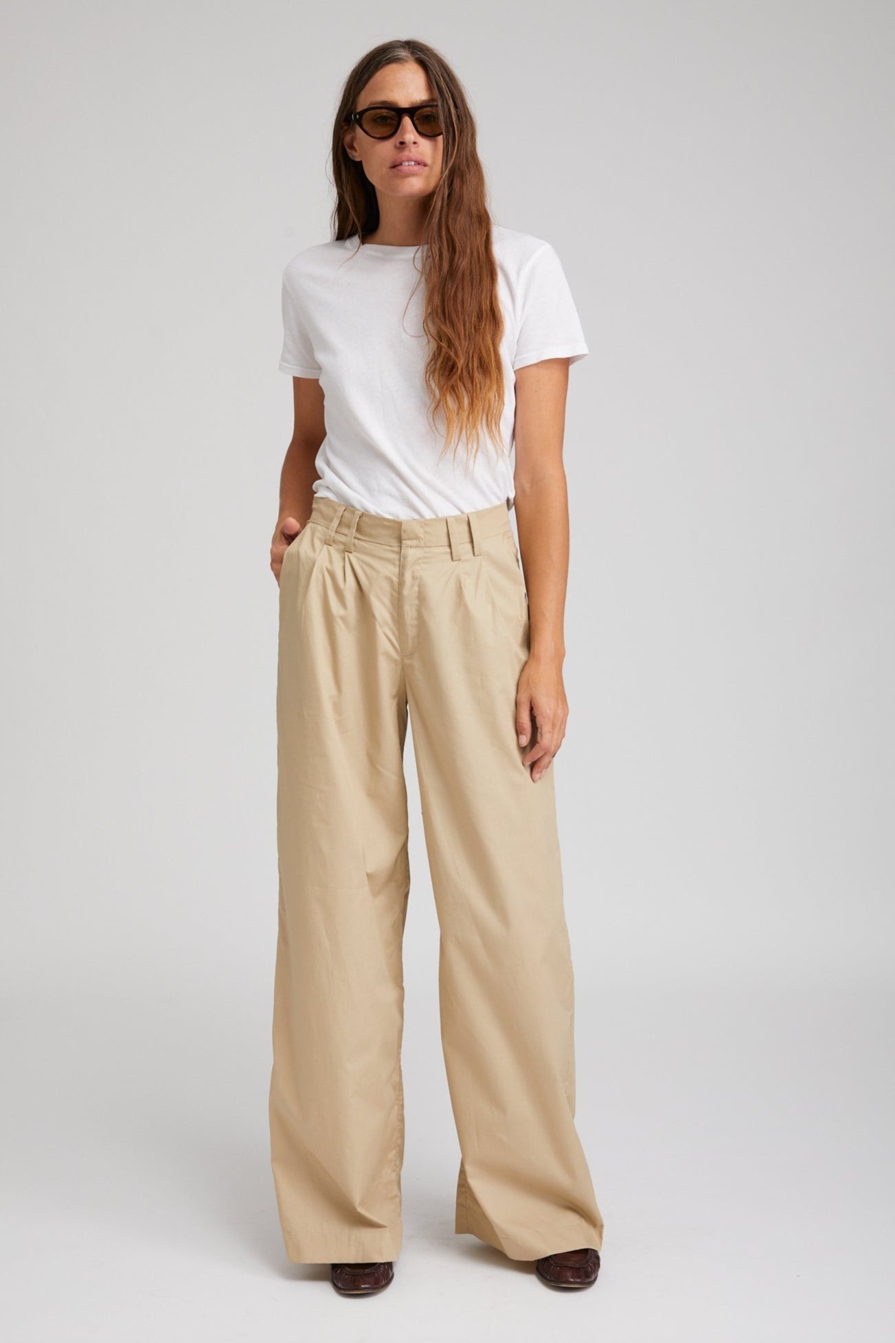 BEIGE COTTON POPLIN PLEATED TROUSERS
