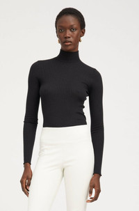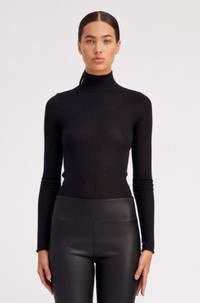 Finely knitted in our high quality, ultra-soft Mongolian Cashmere, this lightweight long sleeve essential will easily become a wardrobe favorite. Elegantly designed with playful lettuce hemlines, this vertical ribbed mock-neck has just the right amount of stretch, and is slightly fitted for a slimming look. With a wide range of styling options, this top tucks seamlessly into all of your high waisted bottoms making it the perfect layering piece to pair with your favorite SPRWMN jeans or trousers. COLOR:Black FIT & MEASUREMENTS - Fits true to size - The first model is 5'11 and wears a size small PRODUCT DETAILS - 100% Cashmere - Sustainably grown, organic yarn - Mock neck - Dry clean only