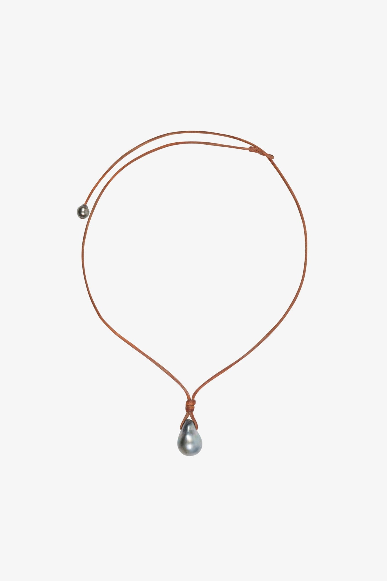 Tahitian black baroque pearl strung on Kangaroo handcut leather. KAYAS Jewelry is the Mykonian home of the Mignot family jewelry, one-of-a-kind pieces, each carrying the family traditions and expertise of three generations. Pearls, pebbles from the beach, sea glass, hammered gold and uncut precious stones are used, all strung on amazing hand worked kangaroo leather to create an individually crafted, elegantly sophisticated ‘bohemian look’. Each subtly dramatic creation seems to uniquely incorporate the marriage of the earth with the sea. Their designs include Black pearls from Tahiti and White and Gold South Sea Pearls from Australia, all handpicked one by one by the family. PRODUCT DETAILS - One-of-a-kind handmade pieces - Tahitian pearl - Kangaroo leather