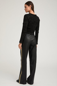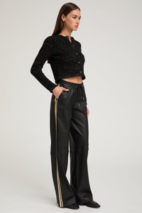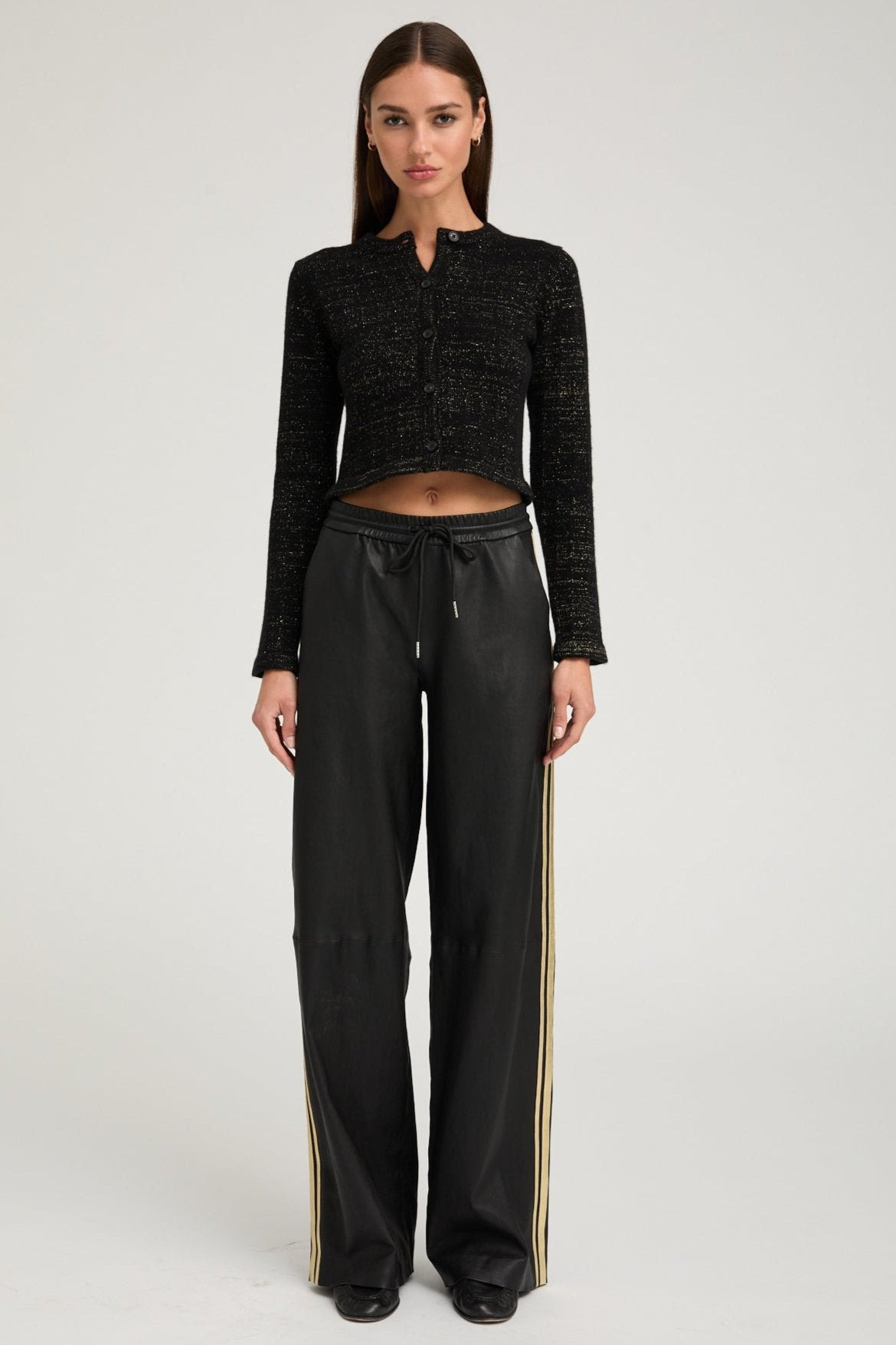 Our take on an athletic track pant made entirely out of our buttery-soft leather. This wide-leg silhouette has a relaxed fit with 2 white athletic stripes down the sides for a chic, sporty look. These pants are made in our signature French stretch-leather, so they feel like a second-skin and are extremely breathable for year-round wear. The adjustable drawstring allows for versatility and can be worn fitted to the waist, as desired. COLOR: Black, Gold Stripes FIT & MEASUREMENTS - Fits true to size; Relaxed fit - Our lambskin gives naturally over time; if in-between sizes, size down - 34" inseam, 11" rise, 11 1/4" leg opening - Anna is 5'11 & wears size Small PRODUCT DETAILS - 100% French Lambskin - Stretch Leather - Cotton-Lycra lining - Eco friendly, hypoallergenic and chrome-free vegetal dyed - Adjustable drawstring waistband, pull-on fit - 2 slit, side pockets - Leather specialist clean only