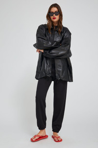 Designed from a high shine black leather and lined in silk, this classic anorak zip-up jacket is cut for an oversized silhouette. Fitted with a drawstring elastic cord at the bottom to adjust the waistline as needed. COLOR:Black FIT & MEASUREMENTS - Fits true to size - Riley wears size Small PRODUCT DETAILS - 100% French Lambskin - Two pockets - Elastic adjustable drawstring - Leather specialist clean only