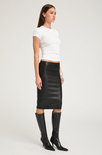 A classic leather pencil skirt that is hand-tailored for a figure-sculpting fit. This ultra-soft, stretch-leather feels like a second-skin and is designed with maximum recovery to conform to your body and maintain its flexible comfort all night long. Featuring an invisible elastic waistband with a mid-length silhouette and a vented back detail. COLOR: Black FIT & MEASUREMENTS - Fits true to size - Meant to fit tight at first-try – leather naturally gives; if in between sizes, size down - 34" length - Model wears size Small PRODUCT DETAILS - 100% French Lambskin - Stretch Leather - Cotton x Lycra lining, elastic waistband - Eco friendly, hypoallergenic and chrome-free vegetal dyed - Leather specialist clean only