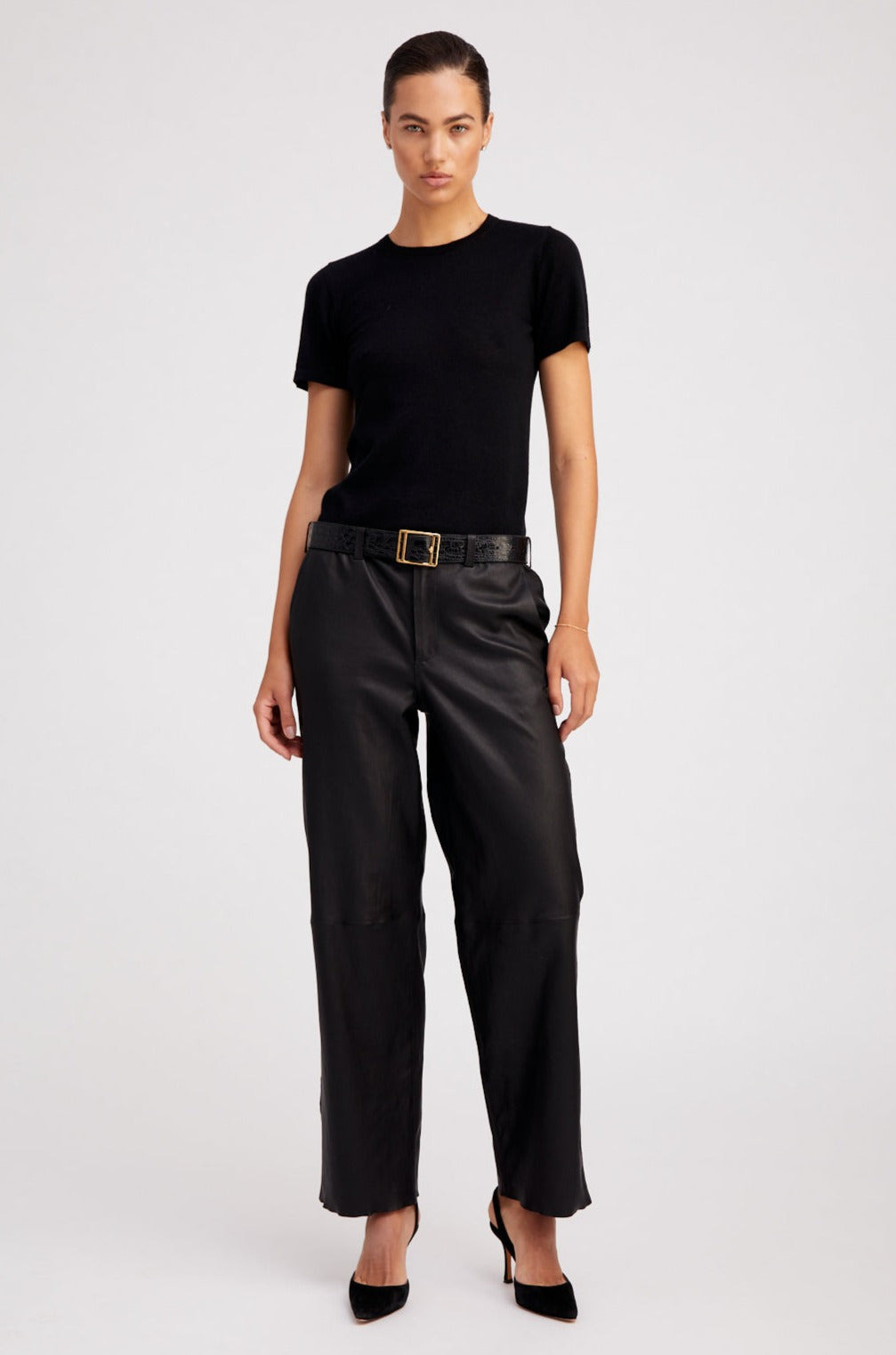 A luxurious take on your classic trouser, made in our buttery-soft, stretch-leather. Get ready for an effortlessly chic and easy to wear relaxed-fit that sits below the waist and hits at the ankle; featuring 2 functional pockets and a concealed zip for a sleek and timeless look. With a wide range of styling options, wear these casually with loafers and a cashmere sweater, or dressed up with heels and turtleneck. COLOR: Black FIT & MEASUREMENTS - Fits true to size - Relaxed fit - Our lambskin gives naturally over time; if in-between sizes, size down - Toma wears size Small PRODUCT DETAILS - 100% French Lambskin - Stretch Leather - Cotton-Lycra lining - Eco friendly, hypoallergenic and chrome-free vegetal dyed - Zipper, hook and eye closure - 2 back welt pockets - Leather specialist clean only