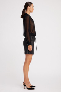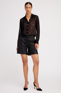 Our take on the classic collared button down, made in a luxurious and featherweight silk chiffon. Designed to have a slightly more slimming fit, this sheer button down pairs well with our silk trousers or your favorite leather trousers. FIT & MEASUREMENTS - Fits true to size - Toma wears size Small PRODUCT DETAILS - 100% Silk Chiffon - See through - Dry clean only