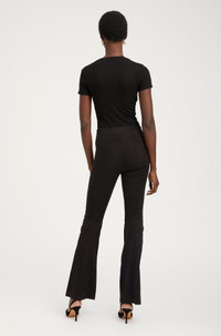Our iconic Suede Super Flare pants are infused with 70's-inspired details, like these signature patch pockets. Fitted with a high-waist and concealed zip fastening at the side for easy wear, these feature a dramatic flare at the ankle for a retro and an elongating look. This silhouette offers a wide range of styling options; wear with a platform shoe or loafers, and a chunky cashmere sweater or vintage tee. COLOR: Black FIT & MEASUREMENTS - Runs large, size down - High rise - 35" Inseam - Adama is 5'11 & wears size Small PRODUCT DETAILS - 100% French Lambskin - Stretch Leather - Cotton x Lycra lining, elastic waistband - Eco friendly, hypoallergenic and chrome-free vegetal dyed - Side zipper - 2 front patch pockets - Leather specialist clean only