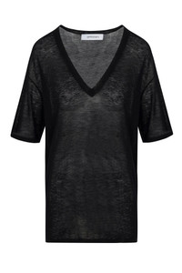 Knitted from our ultra-soft Mongolian yarn, the v-neck tee is made from our featherweight Tissue Cashmere, which enhances its elegant drape and flattering silhouette. Featuring an oversized fit, this everyday tee can be worn on its own or layered with - making it the ultimate transitional piece for any season. COLOR: Black FIT & MEASUREMENTS - Oversized fit - Mika wears size Small PRODUCT DETAILS - 100% Cashmere - Sustainably grown, organic yarn - V-neckline - Ultra lightweight - Room for layering - Dry clean only