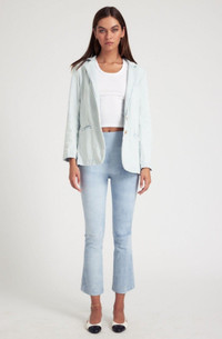 Our fitted denim blazer is the perfect piece to incorporate into any outfit. Lightweight enough to throw over your shoulders in the summer, or layer under a long coat in the winter. WASH: Bruni - Ultra Light Blue FIT & MEASUREMENTS - Fits true to size - Kiana is 5'11 & wears size Small PRODUCT DETAILS - 98% Cotton 2% Elastane - Stretch Denim - Italian Denim - Dry clean only