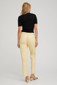 A classic cigarette silhouette pant, made in our signature stretch-leather, are effortlessly chic and easy to wear. Designed for a relaxed fit with a comfortable elastic-stretch waistband and a raw hem. These pants are tailored with pintucks down the front and back for a naturally elongating look that can be worn for any occasion. COLOR: Butter FIT & MEASUREMENTS - Fits true to size - Our lambskin gives naturally over time; if in-between sizes, size down - Emma is 5'10 & wears size Small PRODUCT DETAILS - 100% French Lambskin - Stretch Leather -Cotton-Lycra lining - Elastic waistband, pull-on fit - Eco friendly, hypoallergenic and chrome-free vegetal dyed - Leather specialist clean only
