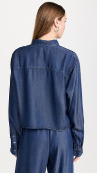 A tasteful take on classic workwear, this button down is made from breathable Tencel, a wood-fiber designed to feel soft while maintaining a crisp structure and feminine drape. Designed to fall just below the natural waist, this silhouette perfectly aligns to meet your waisted bottoms for a clean, chic look, without the hassle of a tuck. With endless styling options, this top pairs well with the matching bottoms or any trouser. COLOR: Camille - Dark Blue Chambray FIT & MEASUREMENTS - Fits true to size - Cropped fit - Kesley wears size Small PRODUCT DETAILS - 100% Tencel