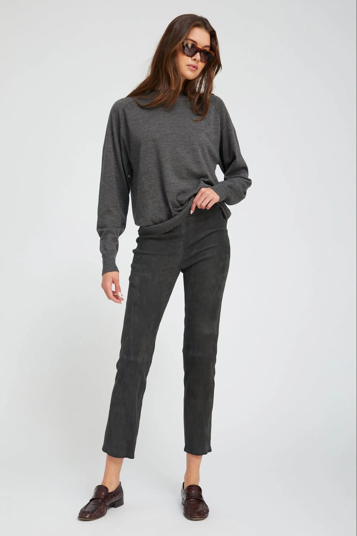 A classic cigarette silhouette pant, made in our signature stretch-suede leather, are effortlessly chic and easy to wear. Designed for a relaxed fit with a comfortable elastic-stretch waistband, these pants combine the look of a classic pant with the comfort and wearability of a legging. COLOR: Charcoal FIT & MEASUREMENTS - Fits true to size - Our lambskin gives naturally over time; if in-between sizes, size down - 30” inseam, 11.5” rise - Kennedy is 5'11" & wears size Small PRODUCT DETAILS - 100% French Lambskin - Stretch Leather - Cotton-Lycra lining - Elastic waistband, pull-on fit - Eco friendly, hypoallergenic and chrome-free vegetal dyed - Leather specialist clean only