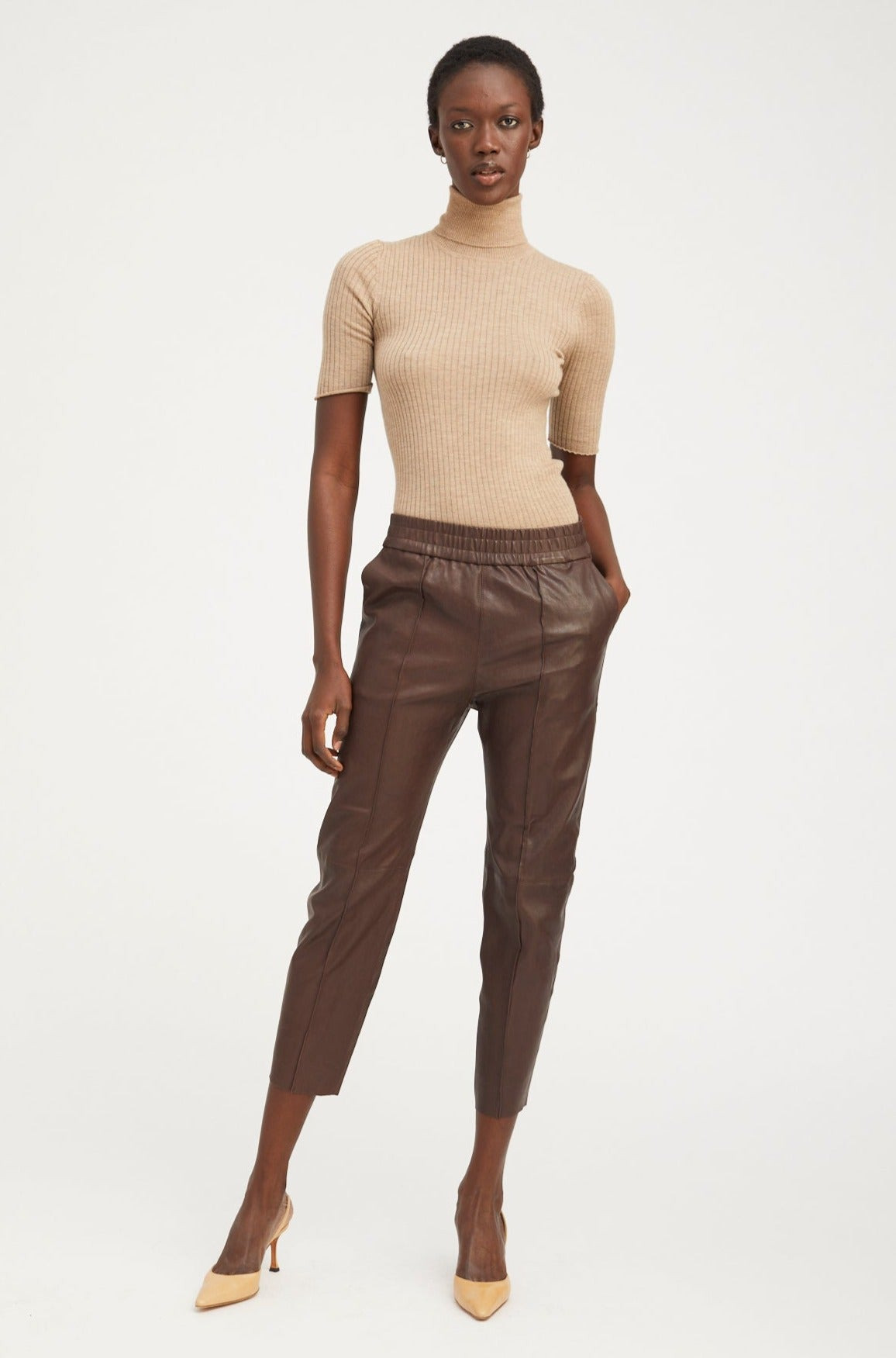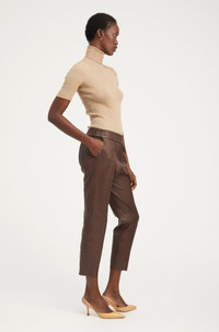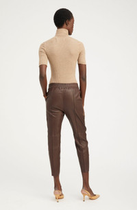 A luxurious take on a classic jogger, made in our signature stretch-leather are effortlessly chic and easy to wear. Designed for a relaxed fit with a comfortable elastic-stretch waistband and a raw hem. These pants are tailored with pintucks down the front and back to lengthen your legs. Wear these casually with sneakers and a tee, or take them out with a pair of heels. COLOR:Dark Chocolate - Reddish Brown FIT & MEASUREMENTS - Fits true to size - Our lambskin gives naturally over time; if in-between sizes, size down - 25.5" inseam, 11" rise - Adama is 5'11 & wears size Small PRODUCT DETAILS - 100% French Lambskin - Stretch Leather - Cotton x Lycra lining, elastic waistband - Eco friendly, hypoallergenic and chrome-free vegetal dyed - 2 functional pockets - Drawstring waist - Leather specialist clean only