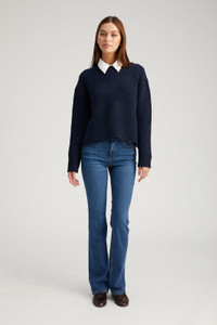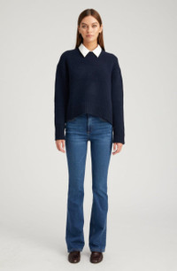 A timeless and versatile silhouette, our signature Micro Flare jeans feature a high rise with a slim fit and a narrow flare that extends past the ankle to elongate the legs. Made from stretch denim that conforms to your body and won't loose it's shape overtime, these pants will quickly become your favorite pair of jeans. Featuring our signature V-back belt loops and faux croc embossed label for a chic detail that accentuates your natural waist, wear these with a classic baby tee and sneakers or a button down and heels. WASH:Gabrielle- Vintage Dark Blue FIT & MEASUREMENTS - Fits true to size - 35" inseam, 11.5" rise, 18.5" leg opening - First model is 5'11 & wears size 26 PRODUCT DETAILS - 98% Cotton 2% Elastane - Stretch Denim - Italian Denim - Machine wash cold, tumble dry low - Front zipper & button closure
