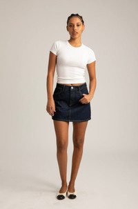 A classic denim mini skirt designed to graze just above the thigh with a slight flare to achieve a true A-line silhouette. With 5 functional pockets and a timeless silhouette, this is a staple that will remain in your wardrobe summer after summer. WASH: Jane - Ultra Dark Rinse FIT & MEASUREMENTS - Fits true to size - 14" length, 44" sweep (opening) - The model is 5'11 and wears size 26 PRODUCT DETAILS - 100% Cotton - Non-Stretch Denim - Japanese Denim - Front zipper & button closure - Machine wash cold, tumble dry low