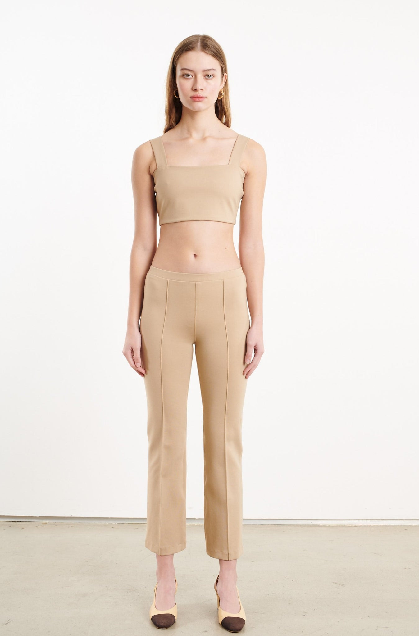 Our classic slimming Ankle Flare silhouette that offers a comfortable yet ultra-flattering fit, designed with pintucks along the front and back to further elongate the legs. Made in our tech-stretch spandex inspired Casanova fabric for a snug feel that retains it's shapeafter all-day wear. Wear these casually with a tucked in sweater, or more dressed up with a tube top and heels. COLOR:Khaki DETAILS: 67% Rayon 28% Nylon 5% Spandex True to size Model wears size Small High rise, slim fit 28" inseam, 8" leg opening Pintucks along the front and back Machine wash cold, Tumble dry low