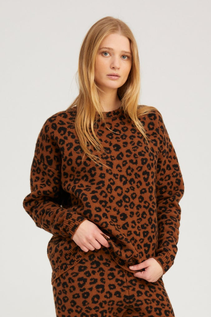 SPRWMN's Leopard Cashmere Sweatshirt, made in our ultra-soft, luxurious Mongolian yarn. With an allover leopard print, this cashmere crewneck is designed for a relaxed fit creating the perfect balance between casual and chic. Complete the look with the matching sweatpants for the perfect look. COLOR: Leopard FIT & MEASUREMENTS - Fits true to size - Emma is 5'10" & wears size Small PRODUCT DETAILS - 100% Cashmere - Sustainably grown, organic yarn - Crewneck - Dry clean only