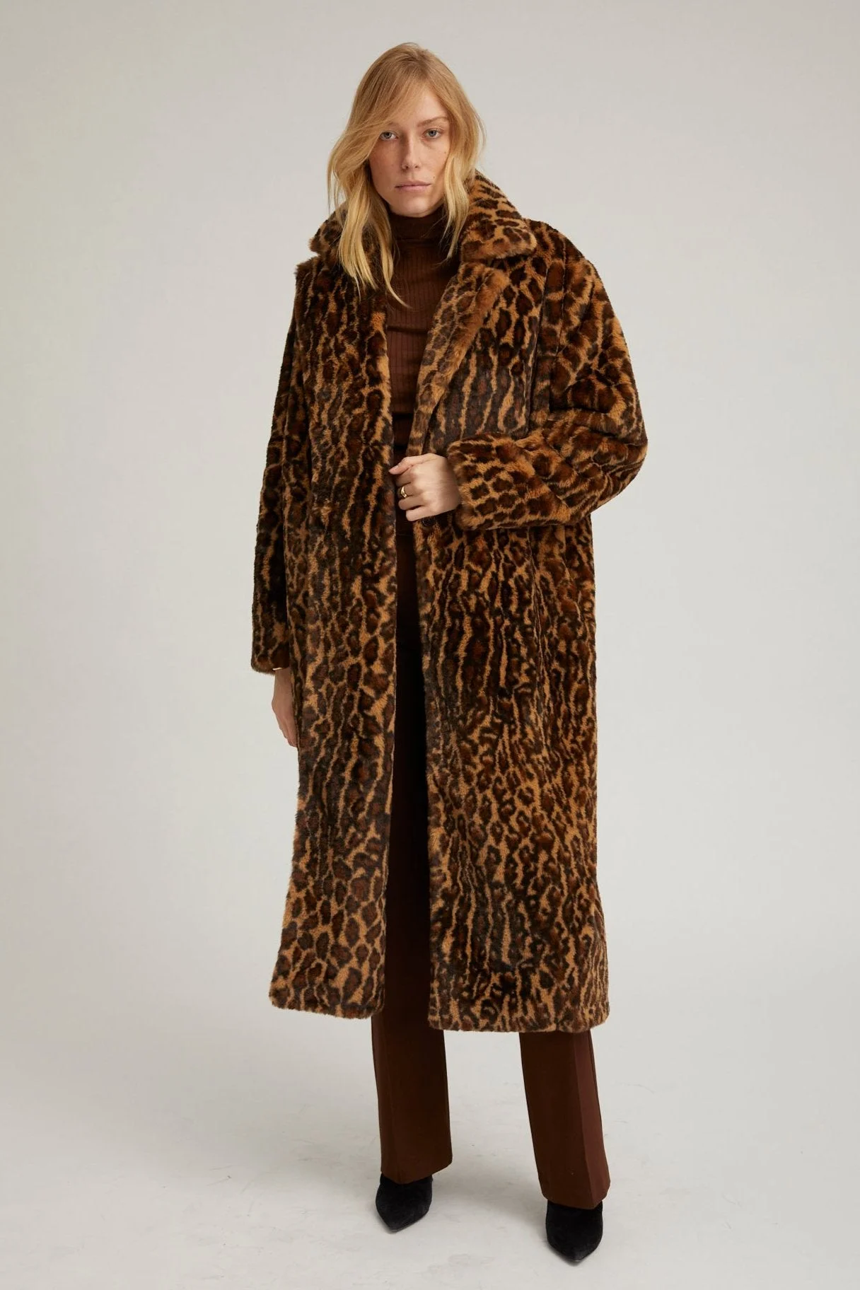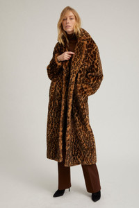 Designed to turn heads. This ultra-soft faux fur long robe has a unisex oversized fit and is made from plush faux-fur material. Finished with classic detailing such as a notched collar and lined in smooth silk. This coat is perfect for layering in the colder months, while looking effortlessly chic. COLOR: Leopard FIT & MEASUREMENTS - Oversized fit - size down if a closer fit is preferred - Lauren wears size Small PRODUCT DETAILS - 50% Polyester, 38% Cotton, 12% Rayon - Notched collar - Single button front closure - Mid length hem - 2 functional side pockets - Dry clean only