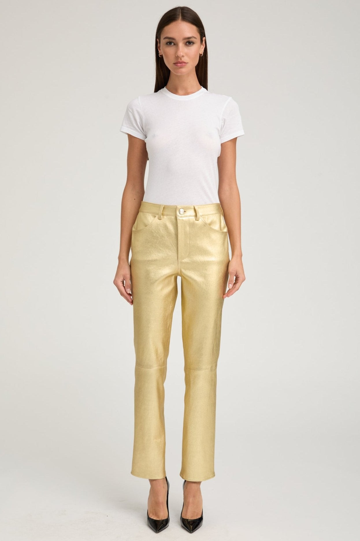 A luxurious straight leg take on our classic trouser, made in our buttery-soft, stretch-leather. An effortlessly chic and easy to wear relaxed-fit that sits below the waist; featuring 2 functional pockets and a concealed zip for a sleek and timeless look. With a wide range of styling options, wear these casually with loafers and a cashmere sweater, or dressed up with heels and a turtleneck. COLOR: Metallic Gold FIT & MEASUREMENTS - Fits true to size - Our lambskin gives naturally over time; if in-between sizes, size down - Anna is 5'11 & wears size Small PRODUCT DETAILS - 100% French Lambskin - Stretch Leather - Cotton-Lycra lining - Eco friendly, hypoallergenic and chrome-free vegetal dyed - Button front, zipper fly - 5 functional pockets - Leather specialist clean only