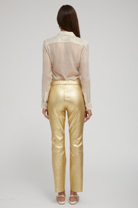 A classic cigarette silhouette pant, made in our signature stretch-leather, are effortlessly chic and easy to wear. Designed for a relaxed fit with a comfortable elastic-stretch waistband, these pants combine the look of a classic pant with the comfort and wearability of a legging. COLOR: Metallic Gold FIT & MEASUREMENTS - Fits true to size - Our lambskin gives naturally over time; if in-between sizes, size down - Anna is 5'11 & wears size Small PRODUCT DETAILS - 100% French Lambskin - Stretch Leather - Cotton-Lycra lining - Elastic waistband, pull-on fit - Eco friendly, hypoallergenic and chrome-free vegetal dyed - Leather specialist clean only