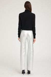 A luxurious take on your classic trouser, made in our buttery-soft, stretch-leather. Get ready for an effortlessly chic and easy to wear relaxed-fit that sits below the waist; featuring 2 functional pockets and a concealed zip for a sleek and timeless look. With a wide range of styling options, wear these casually with loafers and a cashmere sweater, or dressed up with heels and turtleneck. COLOR: Metallic Silver FIT & MEASUREMENTS - Fits true to size - Our lambskin gives naturally over time; if in-between sizes, size down - Relaxed fit - 33 3/4" inseam, 9 1/4" leg opening - Anna is 5'11 & wears size Small PRODUCT DETAILS - 100% French Lambskin - Stretch Leather - Cotton-Lycra lining - Eco friendly, hypoallergenic and chrome-free vegetal dyed - Zipper, hook and eye closure - Leather specialist clean only