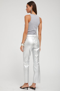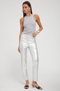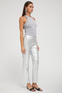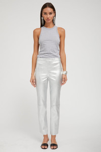 A classic cigarette silhouette pant, made in our signature stretch-leather, are effortlessly chic and easy to wear. Designed for a relaxed fit with a comfortable elastic-stretch waistband, these pants combine the look of a classic pant with the comfort and wearability of a legging. COLOR: Metallic Silver FIT & MEASUREMENTS - Fits true to size - Our lambskin gives naturally over time; if in-between sizes, size down - Anna is 5'11 & wears size Small PRODUCT DETAILS - 100% French Lambskin - Stretch Leather - Cotton-Lycra lining - Elastic waistband, pull-on fit - Eco friendly, hypoallergenic and chrome-free vegetal dyed - Leather specialist clean only