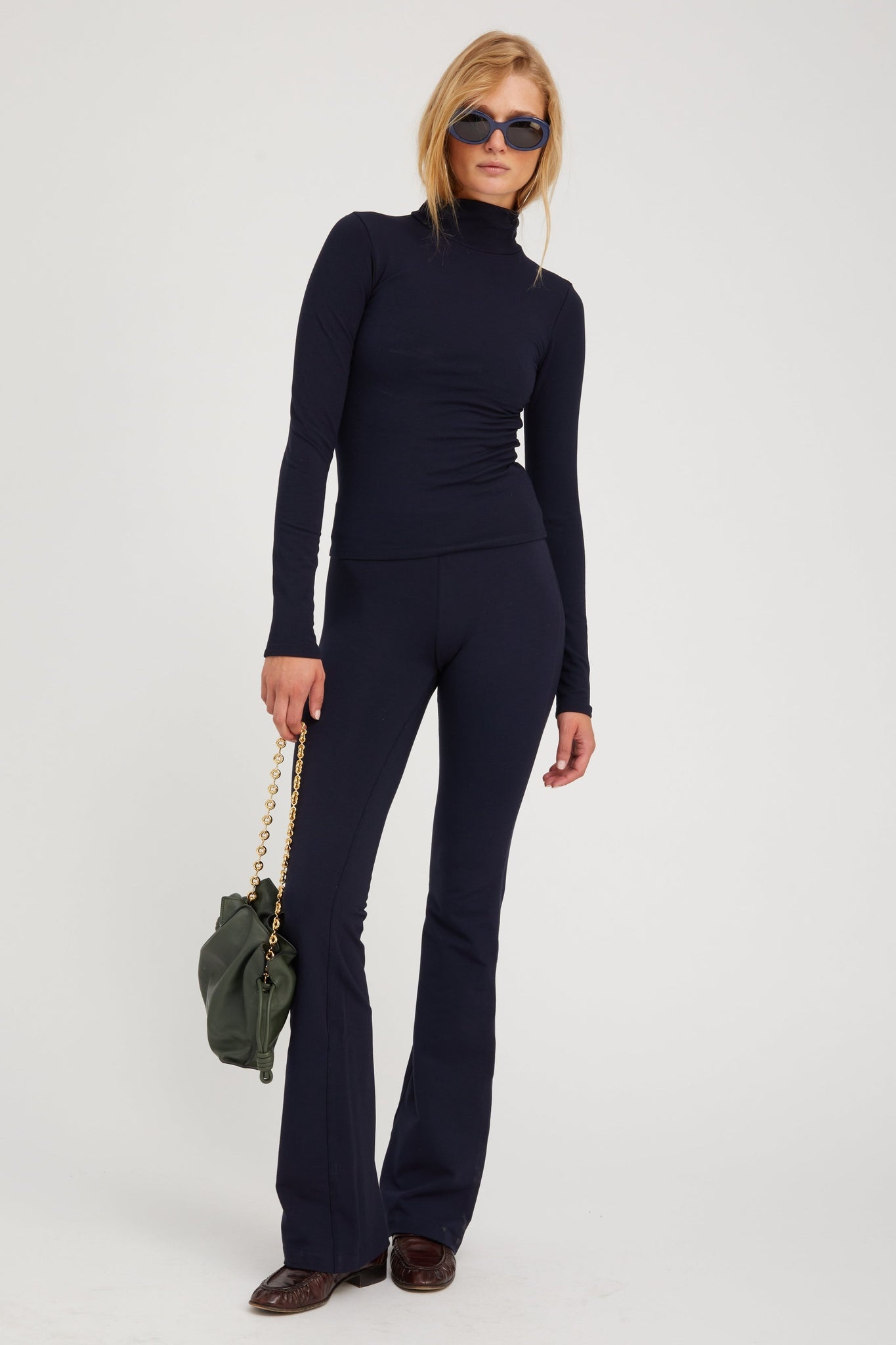 Our classic Micro Flare Pant, designed in our buttery-soft and smooth city jersey knit fabric for a snug feel that retains it's shape after all day wear. Featuring a tight fit from the waist to mid-calf that flares out slightly past the ankle for an elongating look, these are perfect for those who want a comfortable and slimming fit with some added flare. COLOR:Navy FIT & MEASUREMENTS - Fits true to size - High-rise, slim fit - 33" inseam - Model wears size Small PRODUCT DETAILS - 96% Viscose, 4% Elastane - Elastic waistband, pull-on fit - Dry clean only