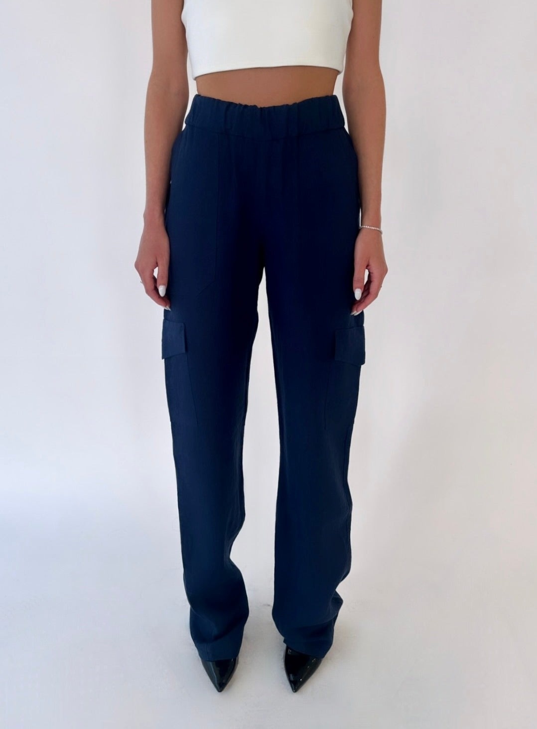 Made of a breathable linen fabric, the Navy Linen Cargo Pants area more chic take on this utilitarian trend. Their ankle length hem makes for the perfect shoe reveal like with a pair of some strappy heels or impressive sneakers. COLOR:Navy 100% linen Fit trueto size Machine wash, delicate Model wears size Small FIT & MEASUREMENTS - Fits true to size PRODUCT DETAILS - 100% linen - Fit trueto size - Machine wash, delicate - Model wears size Small