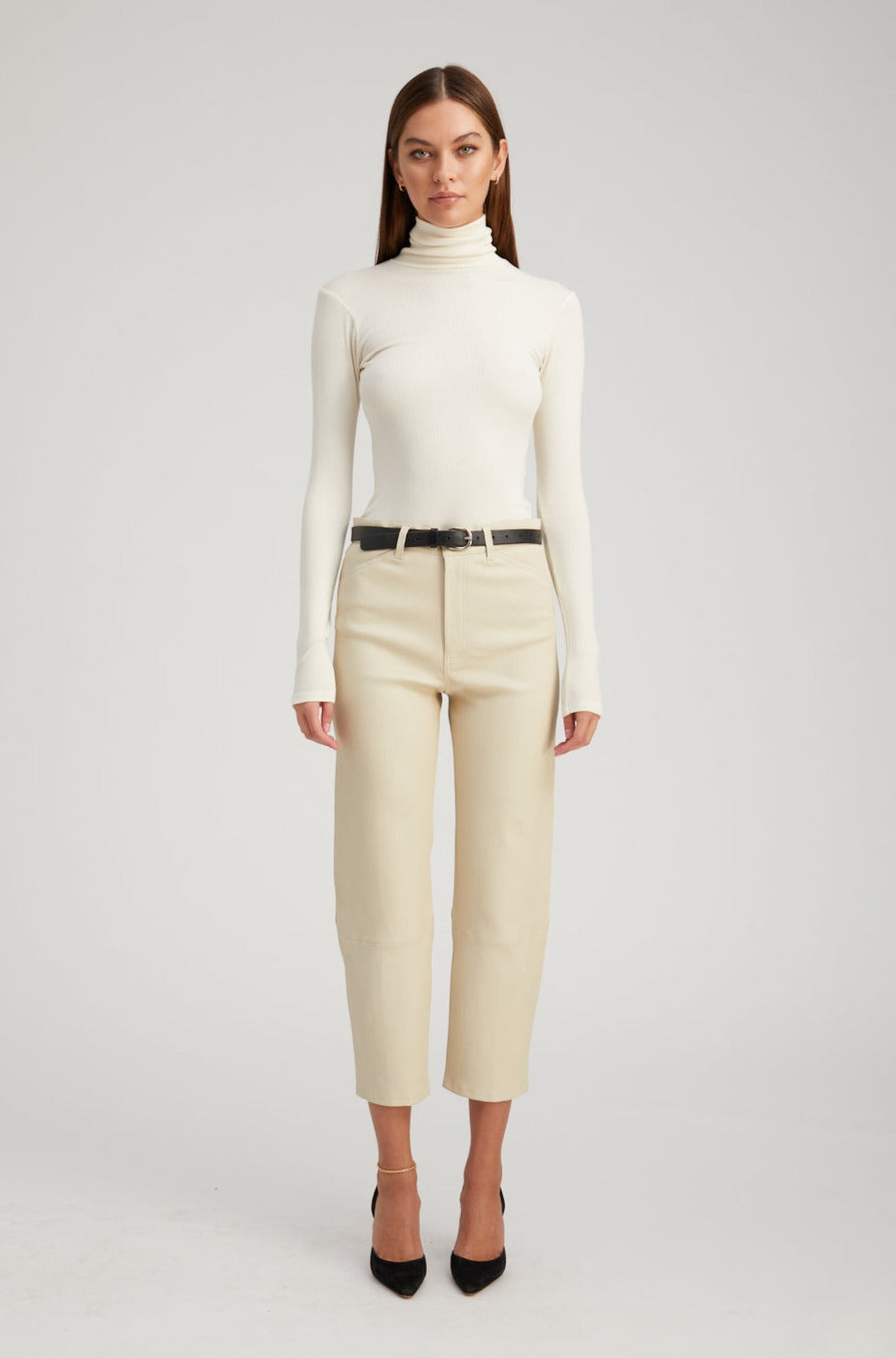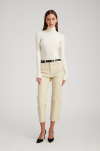 A luxurious take on a classic straight-leg fit made in our signature stretch-leather which areeffortlessly chic and easy to wear. Featuring functionalfive pockets, belt loops, and an-ultra sleek fit, these pants strike the perfect balance of modern and edgy. With a wide range of styling options these pair well with heeled boots or sneakers, a cable sweater or a blouse. COLOR: Off White - Cream FIT & MEASUREMENTS - Fits true to size - Our lambskin gives naturally over time; if in-between sizes, size down - Relaxed, straight fit - 27" inseam, 11" rise, 7" leg opening - Kiana is 5'11 & wears size Small PRODUCT DETAILS - 100% French Lambskin - Stretch Leather - Cotton-Lycra lining - Eco friendly, hypoallergenic and chrome-free vegetal dyed - Button front, zipper fly - 5 functional pockets - Leather specialist clean only