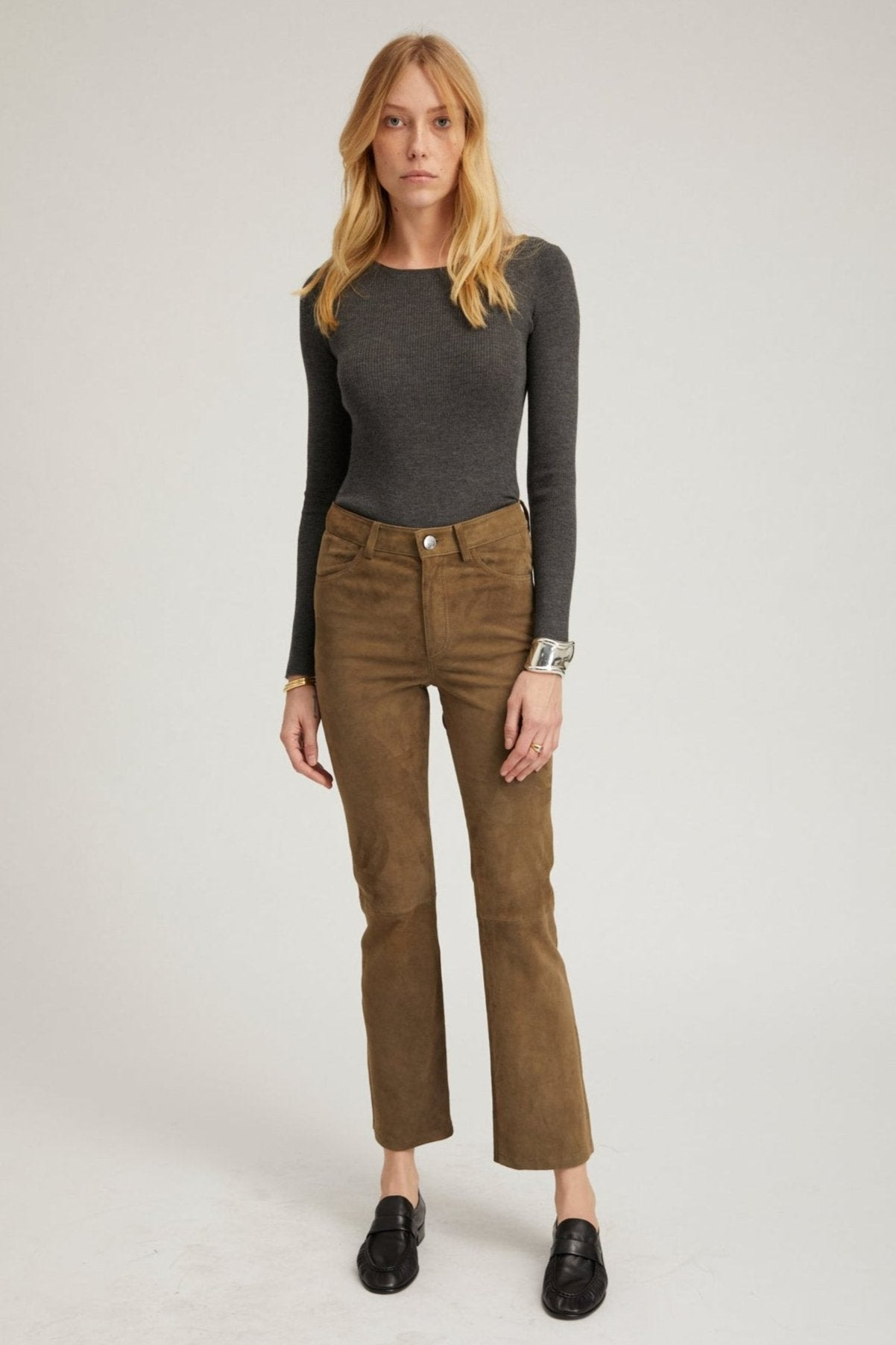 Our 5 Pocket Ankle Flare Pants feature a tight fit with a subtle kick-flare at the ankle for a naturally elongating look. Designed entirely from our buttery soft suede leather, these pants are made for extreme breathability and can be worn every single season. Wear these casually with a fitted Cashmere sweater or dressed up with a silk blouse. COLOR: Olive FIT & MEASUREMENTS - Runs large - Our lambskin gives naturally over time; if in-between sizes, size down - High rise - Lauren wears size Small PRODUCT DETAILS - 100% French Lambskin - Stretch Leather - Cotton-Lycra lining - Eco friendly, hypoallergenic and chrome-free vegetal dyed - Front zipper & button closure - Leather specialist clean only