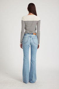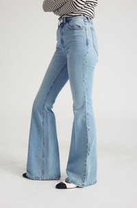Our bootcut will quickly become an essential, and fun, part of your wardrobe. Made from 100% Cotton for a classic denim look and feel, these jeans are designed for a slimming fit that flares past the ankle which creates an elongating look with some added flare. Featuring our signature V-back belt loops and faux croc embossed label for a chic detail that accentuates your natural waist. Easily pair these with anything - our favorite is a baby tee and sneakers or a sweater and heels. WASH: Paradis - Light Blue Vintage Stone Wash FIT & MEASUREMENTS - Fits true to size - 33.5" inseam, 10.5" rise, 10.5" leg opening - Kiana is 5'11 & wears size 26 PRODUCT DETAILS - 100% Cotton - Non-Stretch Denim - Japanese Denim - Front zipper & button closure - 5 pockets - Machine wash cold, tumble dry low